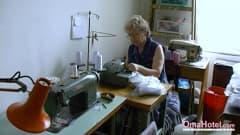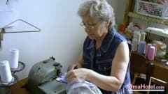 Essa costureira idosa fica excitada enquanto trabalha. Ela começa a se despir e a se acariciar, depois enfia um vibrador em sua buceta peluda.