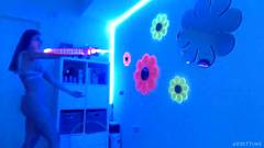 A sublime garota de cabelos azuis se diverte sozinha com um jogo de luzes e seu vibrador. Não perca!