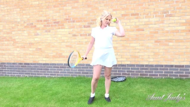 Ao ar livre, essa loira fica nua e se dedilha na grama enquanto assiste a uma aula de tênis, pois as bolas a excitam muito.