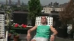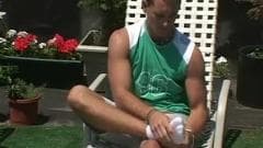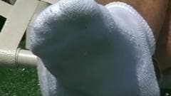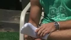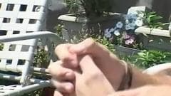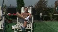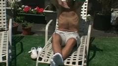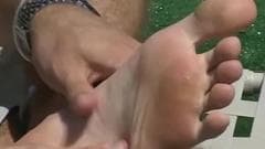 Esse cara está curtindo seus pés ao sol enquanto lambe os dedos e os chupa para deixar seu pau duro.