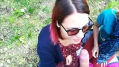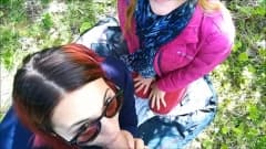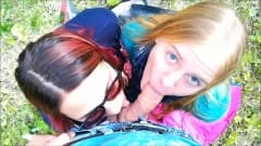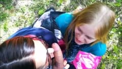 Duas garotas muito ousadas competem para ver quem recebe mais esperma do galo do cara que conheceram no parque.