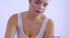 A massagista pegará o pinto na mão e o oleará bem para um bom trabalho manual, ela então subirá sobre o cara para colocá-lo.