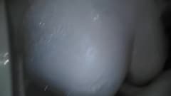 Uma loira de peitos pequenos deixa o amigo do marido entrar na banheira e chupa o pau dele.
