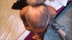 Essa loira de peitos grandes é coberta de tatuagens e não há nada que ela goste mais do que um bom pau duro