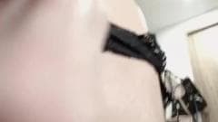 Tranny deslumbrante com peitos grandes esfrega seu pau na cozinha