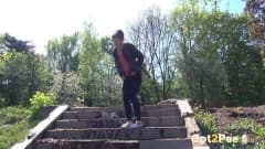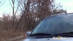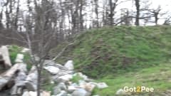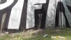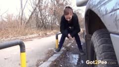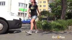 A jovem morena mija na rua, a vagabunda não tem inibições e deixa seu xixi passar pelo buraco no meio da rua. Nada como mijar ao ar livre