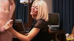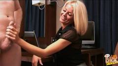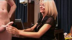 O adorável MILF cospe no galo para lubrificá-lo e dar uma boa masturbação. Ela insiste bem na glande enquanto baba sobre ela.