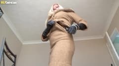 Loira sofisticada tira o casaco e se masturba com suas luvas
