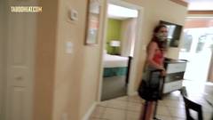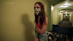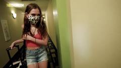 Bailey Base sai de férias, entra no quarto do hotel, fica confortável, nu e se deita na cama.