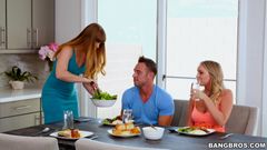 Esta puta não pode se conter mais e agarra o pau do seu cara enquanto estão à mesa! Quando sente ele duro, ela pede que ele a foda por onde quiser.
