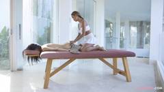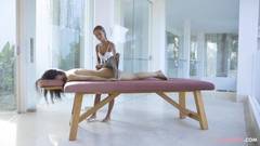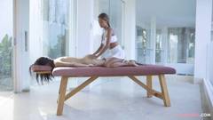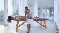 Mulheres asiáticas em uma cena muito quente! A jovem Indo Putri Cinta se despe e faz uma massagem muito boa a sua cliente asiática.