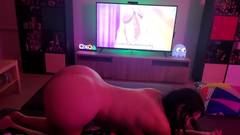 A garota morena peituda fica excitada observando o hentai e monta o pinto de seu parceiro. Não perca isso!