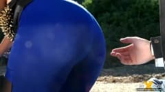 Depois de uma curta caminhada, esta morena peituda fica sendo perfurada por este homem musculado ao ar livre, sem medo de vir alguém!