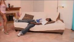 Ela monta seu amigo deitado no sofá e coloca sua buceta na boca para forçá-lo a dar cunnilingus. A vagabunda chupa até que seja suficientemente sólido para foder.