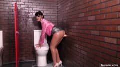 Ela foi ao banheiro e encontrou uma grande quantidade de esperma no chão, começou a gemer até conseguir uma carga para si mesma e ficou super excitada.