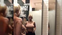 Uma loira linda e luxuriosa mostra seu corpo para a câmera em um provador. Seus grandes peitos e seu lindo traseiro nos excitam