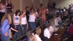 Mulheres empolgadas de todas as idades são o público desse jovem que dança completamente nu e dá em cima de todas as mulheres da boate.
