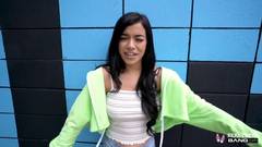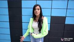 Esta garota latina mostrará suas mamas lá fora e fará um broche no carro, então ela seguirá o cara para pegar seu aparelho.