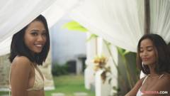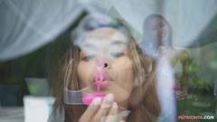 A linda jovem indonésia Putry Cinta e sua amiga se despem. As duas garotas estão se divertindo no jardim nuas, soprando bolhas.