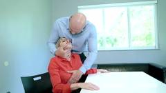 Ele está olhando para ela há algum tempo. Ele está tão excitado que vai acariciar seu colega na frente de outra pessoa e começar a foder