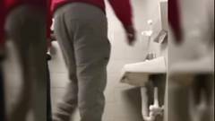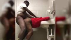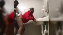 Um casal excitado, uma mulher negra com um grande traseiro e um homem negro gordo estão em um banheiro público e depois de fellatio eles se fodem de pé