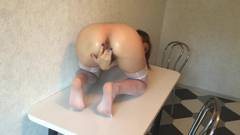 Essa jovem morena usa meias enquanto esfrega sua buceta na mesa da cozinha até o orgasmo!