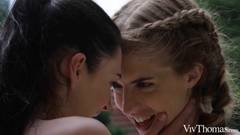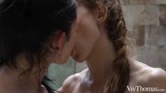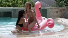 A garota tira o biquine para se bronzear. Sua amiga vê e fica molhadinha, então vai para a piscina para uma fazer a outra gozar com lambidas e siririca!
