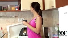 Quando sai da cama pela manhã, a bela Eve Angel vai para a cozinha e começa a se sentir energizada e pronta para se masturbar.