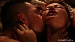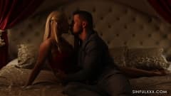 Uma cena escura e muito erótica no boudoir de uma mulher. Anna Polina e Vinna Reed começam acariciando e picando e quando um cara aparece.