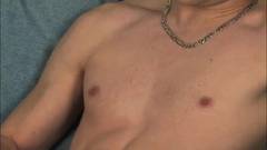 Damien é um homem de 27 anos, de cabelos compridos, que gosta de segurar seu pênis na mão enquanto se masturba e goza em si mesmo.