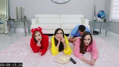 O cara com o galo em chamas não conseguirá resistir às 3 lindas senhoras em casa, ele tentará uma boa aproximação fodendo elas uma de cada vez.