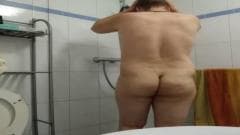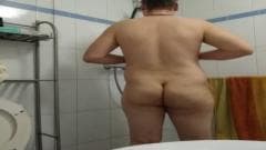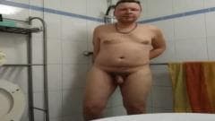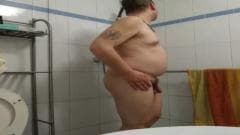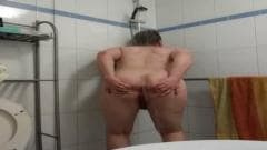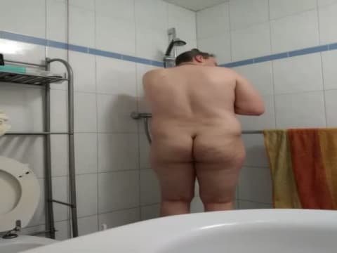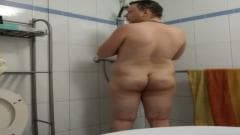 Um homossexual gordo e maduro nos provoca sacudindo suas nádegas e se masturbando no chuveiro. Não perca isso!