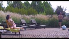 Uma linda morena está sentada em uma espreguiçadeira, tendo sua bunda chupada por um cara com seus dedos. Ela faz sexo oral nele e depois é penetrada.