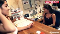 Uma morena bonita termina o trabalho e para relaxar, já no seu quarto ela começa a se masturbar sonhando com um cara. O limpador vê isso e aproveita