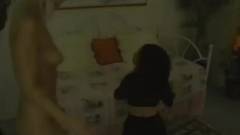 Nessa cena, uma lésbica loira realiza sua fantasia de foder uma anã morena com um strap-on.