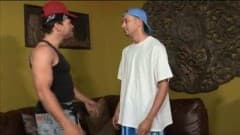 Dois amigos de bairro têm uma sessão de sexo gay. Depois de ver seus músculos, começam por chupar até que o mais musculado decide invadir seu amigo empurrando o pau todo na bunda.