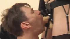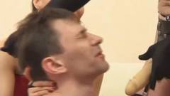 Duas dominadoras com strapon submetem ao cara brutalmente