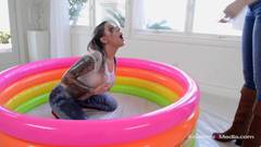 Duas lésbicas lindas sendo pervertidas numa pequena piscina plástica cheia de óleo para uma foda dura com um dildo de cintura