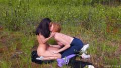 Uma vagabunda ruiva e sua amiga morena passeiam pela natureza e, excitadas por seus corpos, fazem uma parada sexual em um prado para se lamberem.