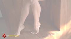 Gostosa tatuada com Marquinha de biquíni vai tirando sua lingerie sexy bem devagarinho na banheira e começa a se masturbar