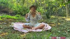 Loira natural relaxa na natureza a bater siririca