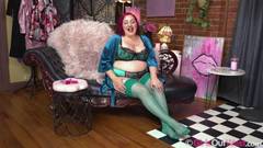 Essa ruiva madura de lingerie azul e verde vai querer acariciar sua buceta e seus peitos, ela vai aproveitar a oportunidade para deslizar sobre o dildo