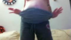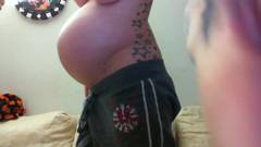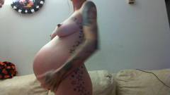 Na frente de sua camera, a mulher grávida mostra seus seios cheios de leite e sua grande barriga. Ela também mostra sua buceta e seu traseiro