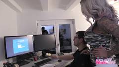 Essa loira peituda é uma safada que quer comer o galo do colega, por isso provoca ele com a sua sensualidade. Pega boquete, fode de canzana e bebe leitinho