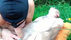 Esta mulher francesa trai seu marido, então enquanto ela suga seu amante na natureza, ela mantém seu capuz.