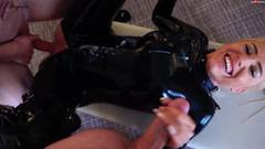 Essa loira espetacular da Daynia tem um fato de couro preto que não vai tirar enquanto é fodida por dois machos. Ménage à trois muito legal.