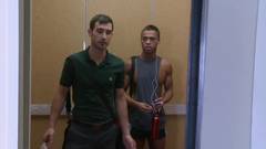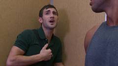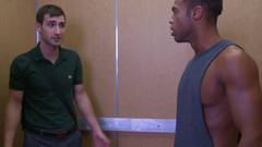 Dois caras bonitinhos ficam presos no elevador quebrado e o técnico sexy os pega fodendo. Eles estarão em breve em um trio gay quente.