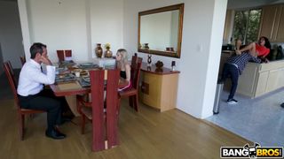 Loira corna nem ligou que sua marido pervertido chupasse os peitoes da empregada e a fudese ela bem na frente dela e ainda gozase no rostinho dela