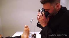 Um gay submisso lambe os pés de seu mestre antes de ser penetrado com um brinquedo sexual e fodido estilo cãozinho nas escadas.