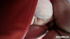 Essa mulher gorda de cabelos curtos, peitos e bunda grandes chupa gentilmente o pau de um rapaz antes que ele a foda bem gostoso!
